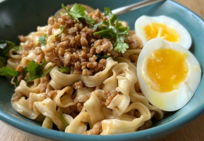 - 一顆流心的溏心蛋: 戳破蛋黃拌進麵裡,增添濃郁感。