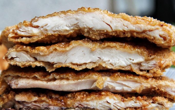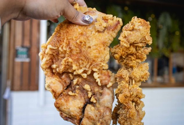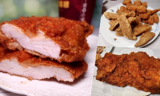 - 雞胸排: 最常見。肉質較紮實,處理得好一樣多汁(像炸雞洋行、惡魔、天使),喜歡大口吃肉感或怕吃帶骨的人選這個。但炸過頭會比較乾柴。